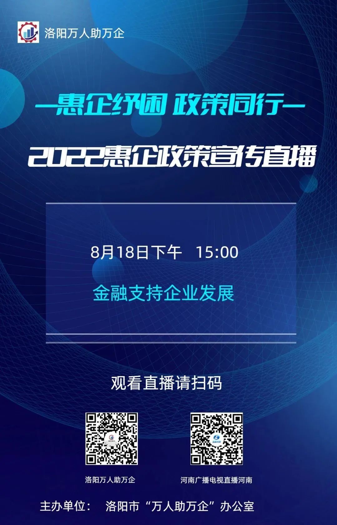 注意事项:此次讲座为线上直播,企业可通过”洛阳万人助万企”视频号、“河南广播电视台直播河南”视频号、“河南广播电视台直播河南”抖音号、“河南广播电视台法治频道” 视频号、“河南广播电视台法治频道《河南法治报道》栏目”抖音号、大象新闻客户端或扫描下方图片二维码观看直播。