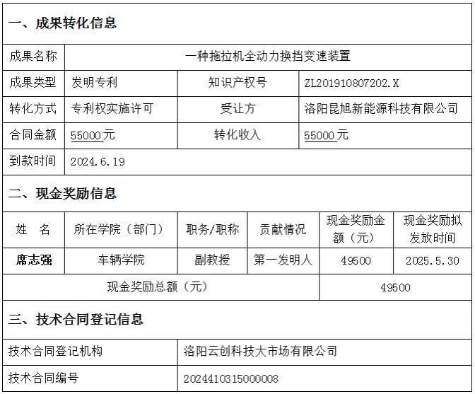 根据《关于科技人员取得职务科技成果转化现金奖励信息公示办法的通知》(国科发政〔2018〕103号),现对我校“一种拖拉机全动力换挡变速装置”科技成果转化项目现金奖励相关信息公示如下: