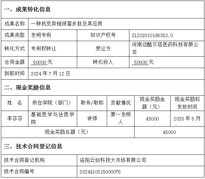 根据《关于科技人员取得职务科技成果转化现金奖励信息公示办法的通知》(国科发政〔2018〕103号),现对我校“一种抗变异链球菌多肽及其应用”科技成果转化项目现金奖励相关信息公示如下: