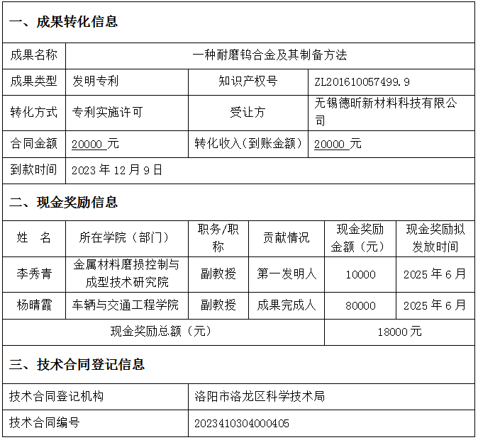 根据《关于科技人员取得职务科技成果转化现金奖励信息公示办法的通知》(国科发政〔2018〕103号),现对我校“一种耐磨钨合金及其制备方法”科技成果转化项目现金奖励相关信息公示如下: