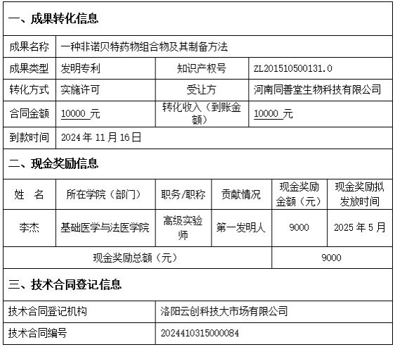 根据《关于科技人员取得职务科技成果转化现金奖励信息公示办法的通知》(国科发政〔2018〕103号),现对我校“一种非诺贝特药物组合物及其制备方法”科技成果转化项目现金奖励相关信息公示如下:
