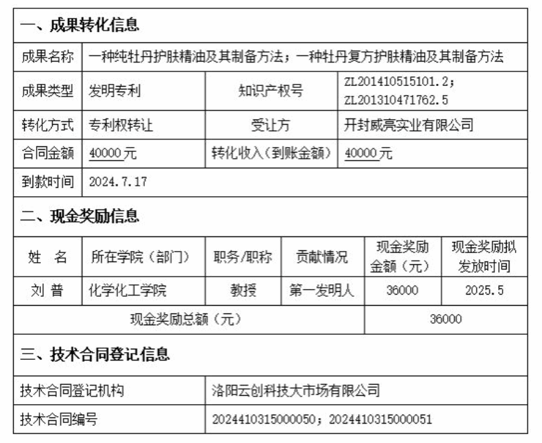 根据《关于科技人员取得职务科技成果转化现金奖励信息公示办法的通知》(国科发政〔2018〕103号),现对我校“一种纯牡丹护肤精油及其制备方法;一种牡丹复方护肤精油及其制备方法”科技成果转化项目现金奖励相关信息公示如下: