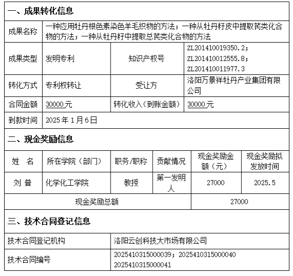 根据《关于科技人员取得职务科技成果转化现金奖励信息公示办法的通知》(国科发政〔2018〕103号),现对我校“一种应用牡丹根色素染色羊毛织物的方法;一种从牡丹籽皮中提取芪类化合物的方法;一种从牡丹籽中提取总芪类化合物的方法”科技成果转化项目现金奖励相关信息公示如下: