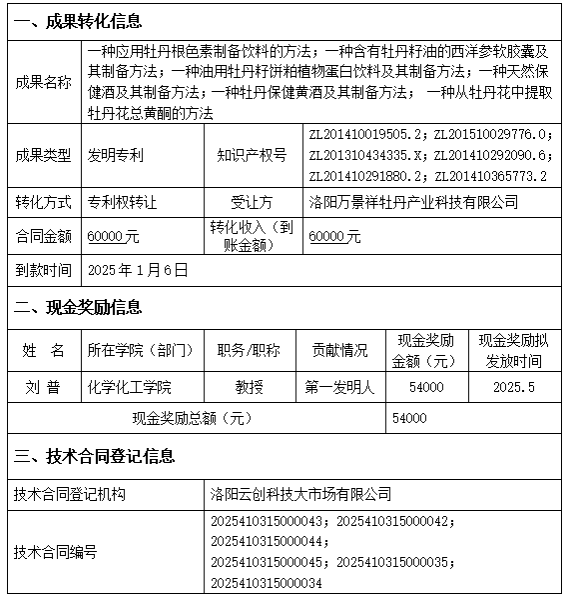 根据《关于科技人员取得职务科技成果转化现金奖励信息公示办法的通知》(国科发政〔2018〕103号),现对我校“一种应用牡丹根色素制备饮料的方法;一种含有牡丹籽油的西洋参软胶囊及其制备方法;一种油用牡丹籽饼粕植物蛋白饮料及其制备方法;一种天然保健酒及其制备方法;一种牡丹保健黄酒及其制备方法; 一种从牡丹花中提取牡丹花总黄酮的方法”科技成果转化项目现金奖励相关信息公示如下: